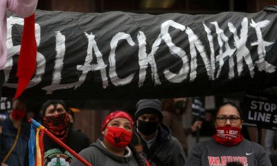 © Reuters. FILE PHOTO: Jasilyn Charger (L) listens to speakers during a protest meant for U.S. President Joe Biden featuring Indigenous youths who live in communities...