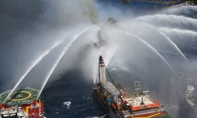 3/3 © Reuters. Boats spray water onto an offshore oil platform that caught fire at the Pemex’s Cantarell Field, in the Bay of Campeche, Mexico July...