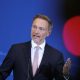 © Reuters. German Finance Minister Christian Lindner is pictured next to the recording light of a TV camera as he presents Germany’s new tax revenue estimates...