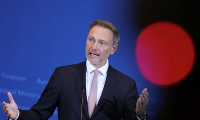 © Reuters. German Finance Minister Christian Lindner is pictured next to the recording light of a TV camera as he presents Germany’s new tax revenue estimates...