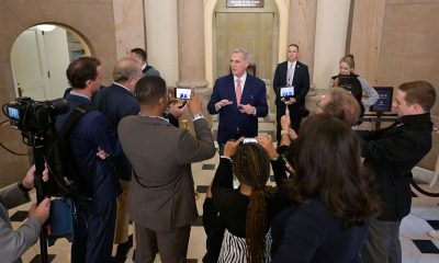 © Reuters. U.S. House Speaker Kevin McCarthy (R-CA) speaks with reporters as the deadline to avert a partial government shutdown approaches on Capitol Hill in Washington,...