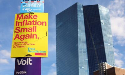 © Reuters. A view shows the placards of the political parties in front of the European Central Bank (ECB) building in Frankfurt, Germany, September 14, 2023....