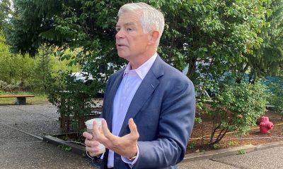 © Reuters. FILE PHOTO: Philadelphia Federal Reserve Bank President Patrick Harker speaks with CNBC’s Steve Liesman (not pictured) after an interview ahead of the annual Kansas...