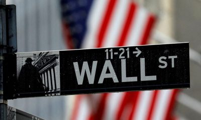 © Reuters. FILE PHOTO: Raindrops hang on a sign for Wall Street outside the New York Stock Exchange in Manhattan in New York City, New York,...