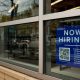 © Reuters. FILE PHOTO: An employee hiring sign with a QR code is seen in a window of a business in Arlington, Virginia, U.S., April 7,...