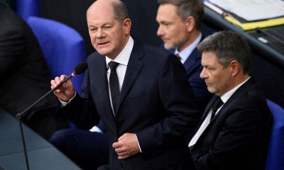 © Reuters. FILE PHOTO: Chancellor Olaf Scholz speaks next to Finance Minister Christian Lindner and Economy and Climate Minister Robert Habeck during a hearing at Germany’s...
