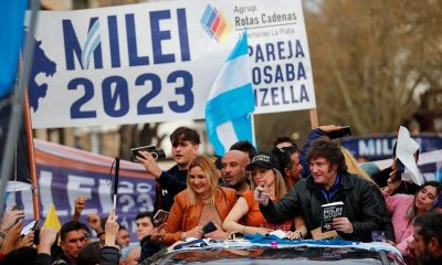 © Reuters. Argentine presidential candidate Javier Milei for La Libertad Avanza coalition gestures next to Carolina Piparo, candidate for Governor of the Province of Buenos Aires,...