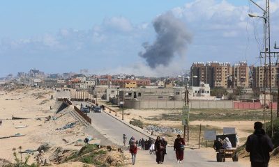 3/3 © Reuters. Smoke rises following an Israeli strike as Palestinians fleeing north Gaza due to Israel’s military offensive move southward, amid the ongoing conflict between...