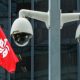 © Reuters. A Hong Kong flag is flown behind a pair of surveillance cameras outside the Central Government Offices in Hong Kong, China July 20, 2020....