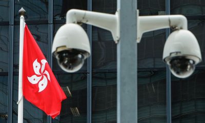 © Reuters. A Hong Kong flag is flown behind a pair of surveillance cameras outside the Central Government Offices in Hong Kong, China July 20, 2020....