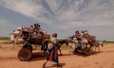 © Reuters. FILE PHOTO: A Sudanese woman, who fled the conflict in Murnei in Sudan’s Darfur region, walks beside carts carrying her family belongings upon crossing...