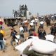 © Reuters. FILE PHOTO: Palestinians carry bags of flour they grabbed from an aid truck near an Israeli checkpoint, as Gaza residents face crisis levels of...