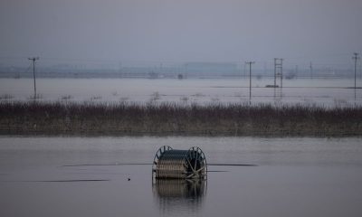 5/5 © Reuters. An irrigation hose reel is partially submerged by floodwater, following the extreme flooding of last September, near the village of Stefanovikeio, Greece, February...