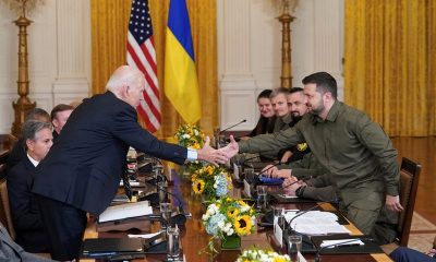 © Reuters. U.S. President Joe Biden and Ukraine President Volodymyr Zelenskiy shake hands across the table during a meeting in the East Room of the White...