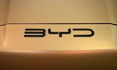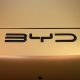 © Reuters. The logo of the BYD Auto company is seen on a BYD SEAL electric vehicle during a BYD store opening at the car dealership...