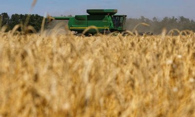 © Reuters. A combine harvests wheat in a field in the course of Russia-Ukraine conflict near the settlement of Nikolske in the Donetsk Region, Russian-controlled Ukraine,...