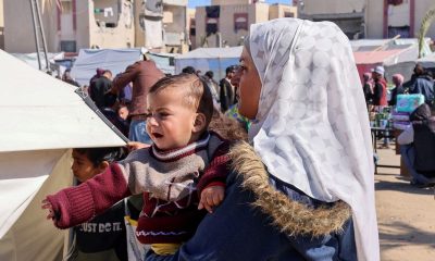 5/5 © Reuters. A displaced Palestinian woman holds her son as she waits to get him examined by a doctor, outside a medical tent, amid the...