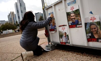 5/5 © Reuters. Dahlia Cooper hangs a picture of her father-in-law Amiram Cooper, who was kidnapped on the deadly October 7 attack by Palestinian Islamist group...