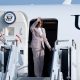 © Reuters. FILE PHOTO: U.S. Vice President Kamala Harris gestures as she boards Air Force Two after attending the 43rd ASEAN Summit at the Soekarno-Hatta International...
