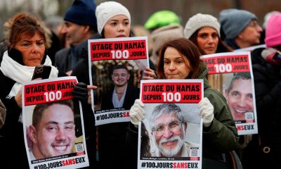 4/4 © Reuters. FILE PHOTO: People hold posters depicting Israeli hostages in Gaza during the event “100 days 100 voices” to mark 100 days since the...
