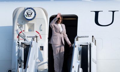 © Reuters. FILE PHOTO: U.S. Vice President Kamala Harris gestures as she boards Air Force Two after attending the 43rd ASEAN Summit at the Soekarno-Hatta International...