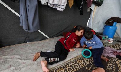 5/5 © Reuters. Laila Al-Sultan, a displaced Palestinian girl who was wounded in an Israeli strike that killed her father, plays with her brother Khaled inside...