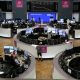 © Reuters. A worker decorates the Frankfurt stock exchange with Nucera logos for the upcoming IPO of Thyssenkrupp’s hydrogen division Nucera as the German share price...