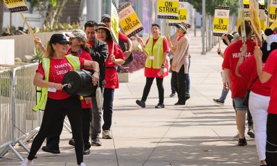 4/4 © Reuters. People protest in front of Hotel Indigo as unionized hotel workers in Los Angeles and Orange County go on strike, in Los Angeles,...