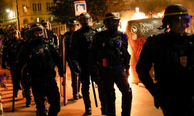 5/5 © Reuters. A group of police officers walk as people protest following the death of Nahel, a 17-year-old teenager killed by a French police officer...
