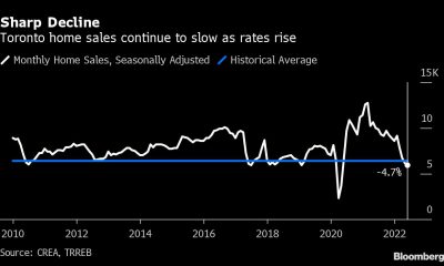 (Bloomberg) — Toronto home prices dropped for a fourth straight month and sales tumbled as rising borrowing costs rapidly cool demand for properties in Canada’s financial...