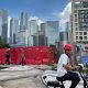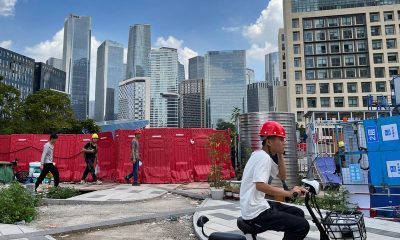 © Reuters. FILE PHOTO: Workers walk past an under-construction area with completed office towers in the background, in Shenzhen’s Qianhai new district, Guangdong province, China August...