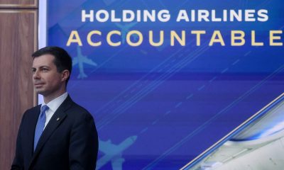 © Reuters. Secretary of Transportation Pete Buttigieg listens as U.S. President Joe Biden speaks about the airline industry and consumer protections from the South Court Auditorium...