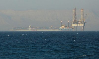 © Reuters. FILE PHOTO: A container ship crosses an oil platform at the Gulf of Suez towards the Red Sea before entering the Suez Canal, outside...