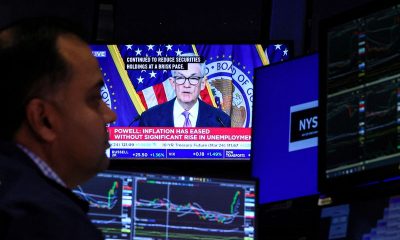 © Reuters. FILE PHOTO: A trader works, as a screen displays a news conference by Federal Reserve Board Chairman Jerome Powell following the Fed rate announcement,...