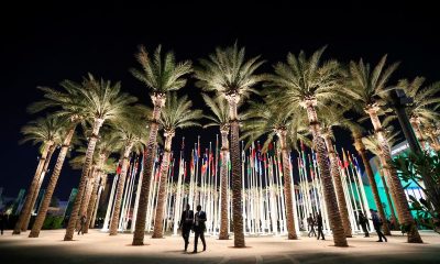 © Reuters. FILE PHOTO: Delegates walk past flag posts at the Dubai’s Expo City after attending the World Climate Action Summit, during the United Nations Climate...