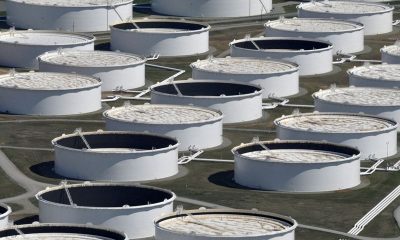 © Reuters. FILE PHOTO: Crude oil storage tanks are seen from above at the Cushing oil hub, appearing to run out of space to contain a...